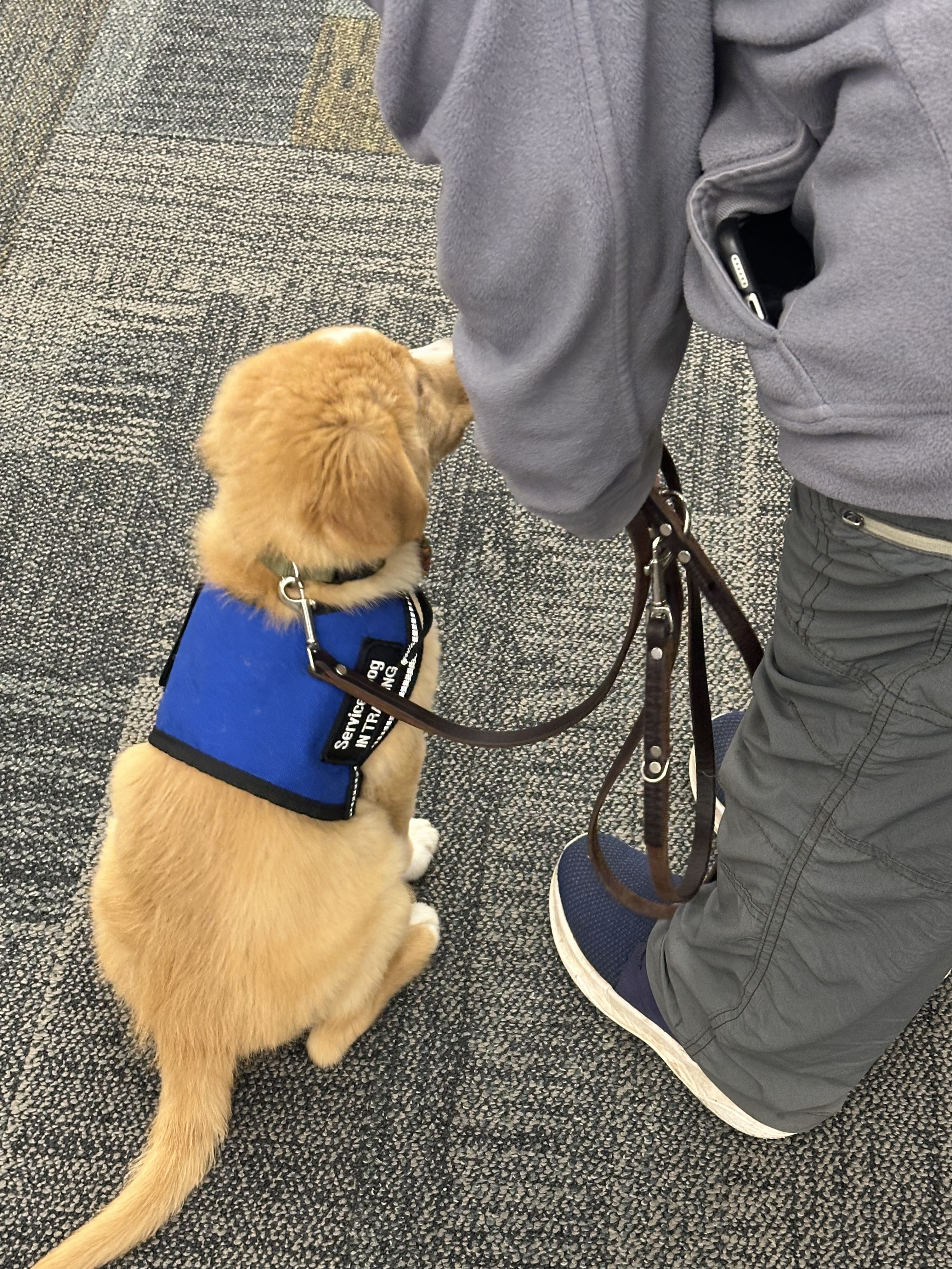 This week, he also visited the local library and showed off his awesomeness with his first “on the floor” visit on a loose leash. He met a man with a walker, a handful of kiddos, and checked out trollies, wheeled chairs, and sitting areas. He’s soaking in every bit of it and basking in the glory of being told he’s the cutest and smartest puppy ever. Funnily enough, our work on using his paws transferred easily to him being held up to the door pads at the library and immediately pressing them when asked to touch. Good boy! He seemed pretty chuffed with himself.