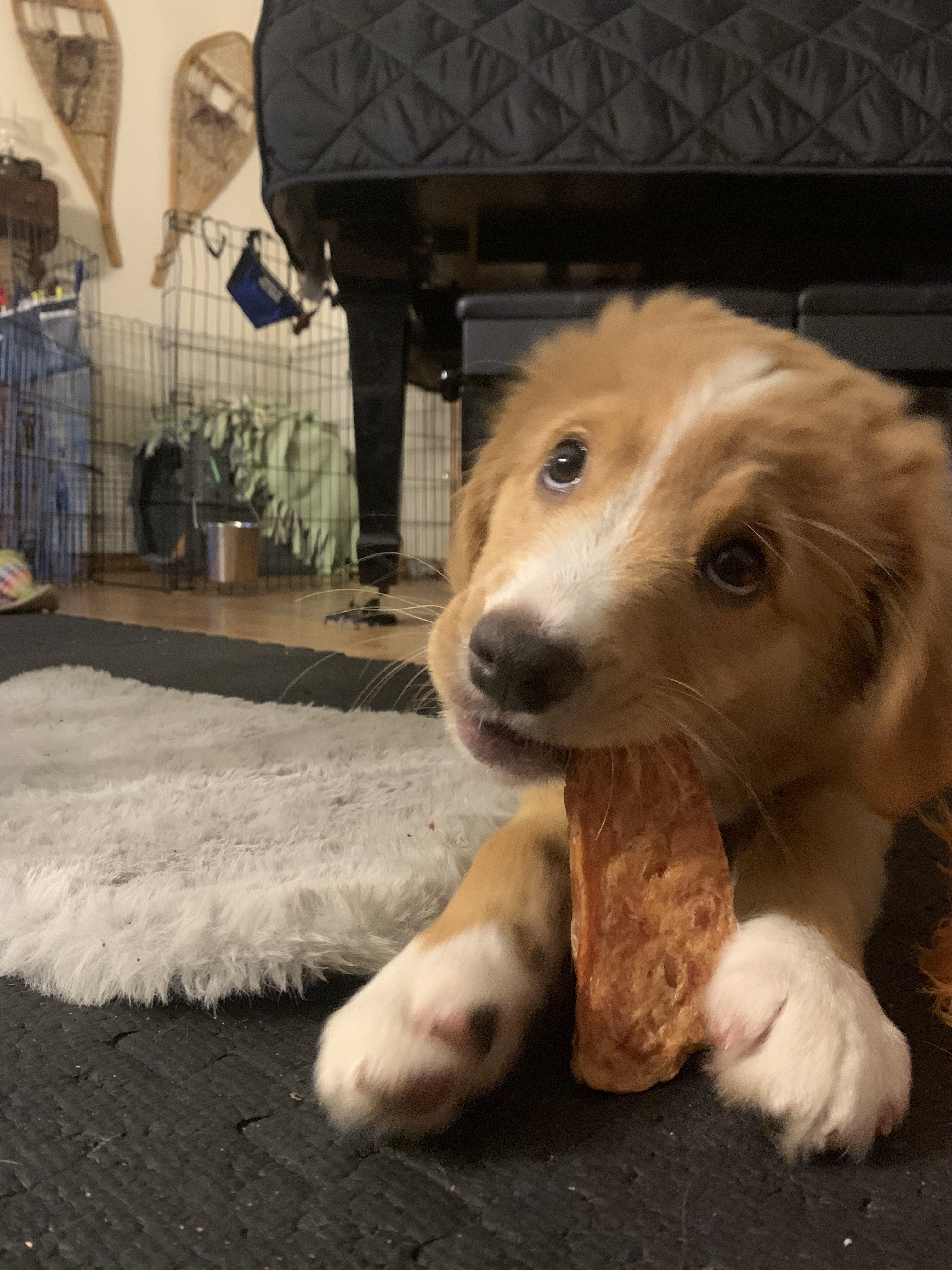 Waffles now has multiple 8-10 minute training sessions every day. He also gets a lot of play time, socialization fun time, and people/animal neutral socialization time in public. He’s starting STAR Puppy kindergarten this week! Playing with other puppies is essential to acquiring proper bite inhibition skills. He’s also going to be learning the difference between “work” and “social time” and building on an already pretty good on-off switch. Hopefully this will help us when adolescence hits and the Brain Fairy makes away with his brain power.