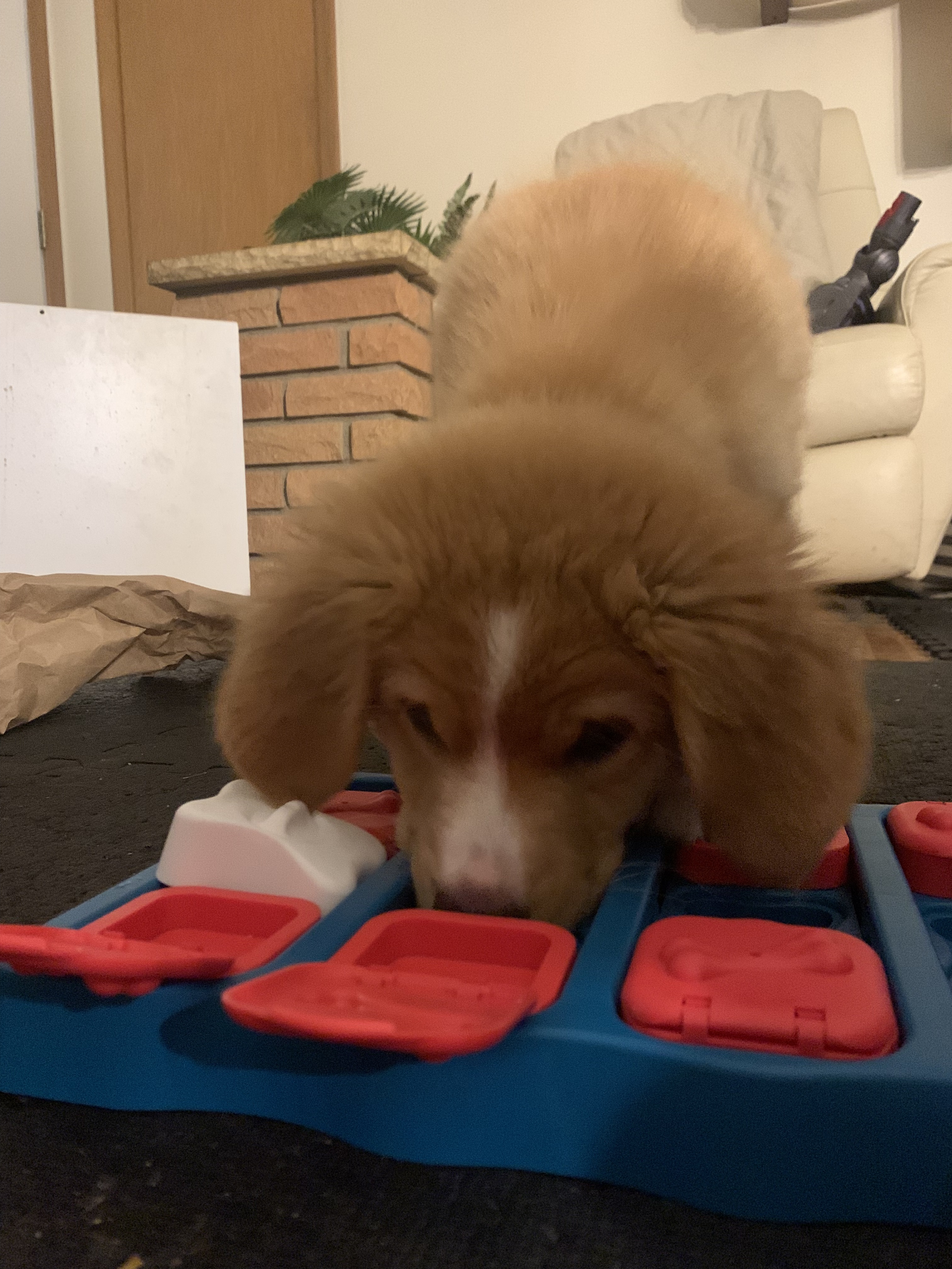 Out of all dogs I’ve trained, Waffles is by far the most puzzle motivated dog I’ve ever had. He absolutely loves using his brain, nose, and paws to solve mechanical puzzles. We’re using this to our advantage in training! We do have some fancy puzzles, but puzzles don’t have to be fancy! Treats in a two-liter bottle (slightly crushed) without its cap… treats in boxes and wrapped in fleece… all of these things make use of brain power!