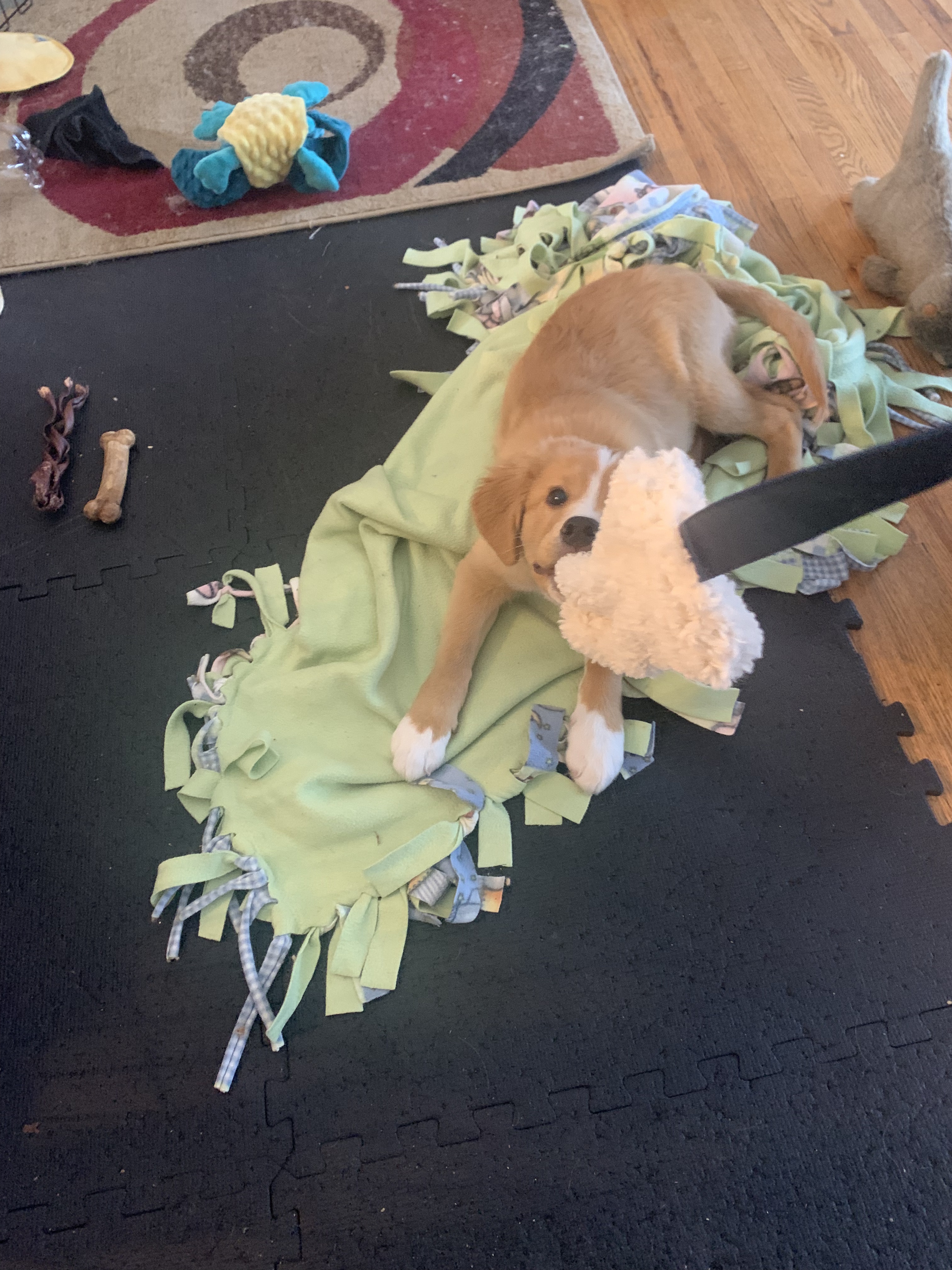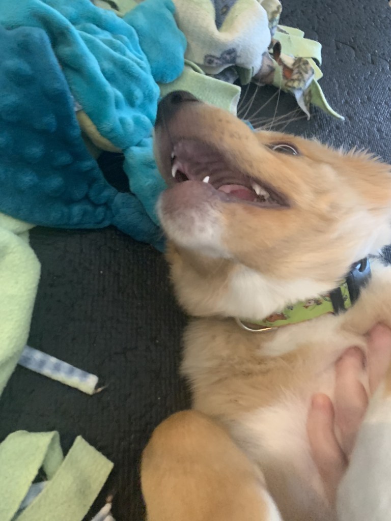 We’re also specifically working on impulse control. There are lots of fun games you can play with a puppy to help them build their “think before you act” skills. Here are some of my favorites!