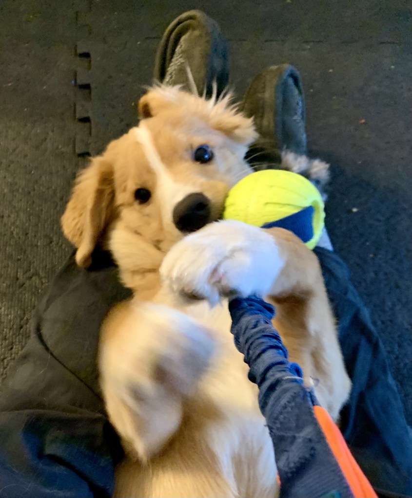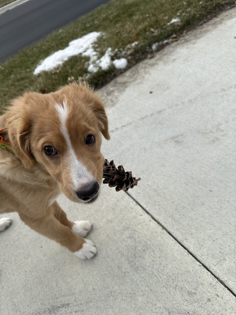 He’s now 24.1 pounds and has lost a couple of front teeth. He has developed some pretty funny little quirks — on leisure walks (rather than training walks) he likes to carry an emotional support pine cone or stick for the entirety of his walk. He currently refuses to do his “dirty sinful business” anywhere but home, and it must ONLY happen in his designated spot. We’ll start addressing that in the coming days and weeks and out-stubborn him if we can!