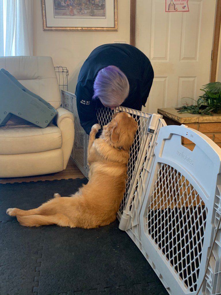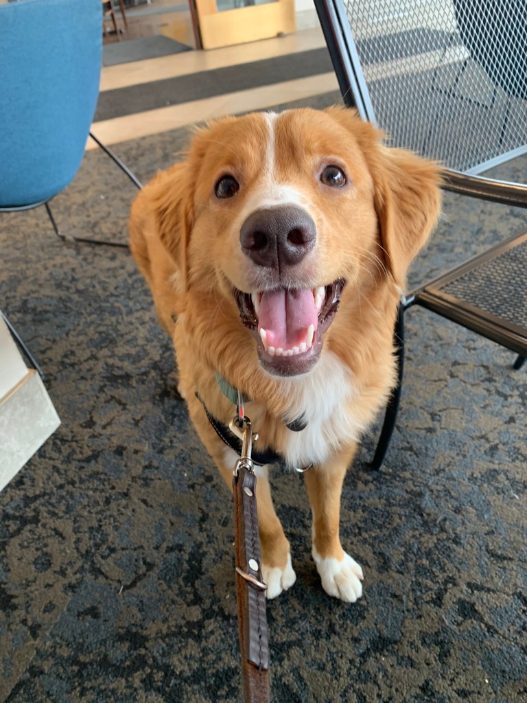 - Service and guide training — we’re working on a bunch of work cues and building some new skills such as the formal take, hold, bring it, and pull. He’s also learning navigational instructions when in harness and he loves every minute of it! He has figured out the difference between wearing work clothes and being a “naked dog”, which will serve him well.