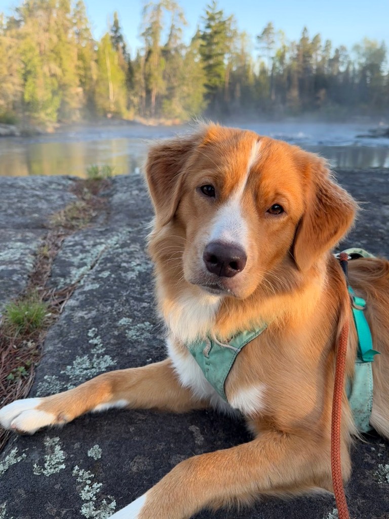 - Explore new places together, just like you did when puppy was little. We took Waffles out to the BWCA recently. World’s longest dog walk and dog swim! He got to sniff, explore, taste stuff, climb, slip around rocks, figure out how his body works in space. We visit new places and explore together. When Waffles gets a little concerned, he comes to check in with me and I encourage him to “go see”. He goes through short periods where he worries about new things more than he did before, but those times always pass.