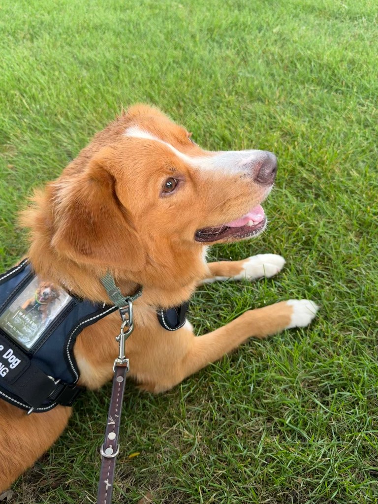 For work, he’s been getting public access exposure off and on and continues to be a true gentleman while working in public. The foundations we have in place seem to be quite solid, so we keep building on what we’ve got! Right now, he’s learning how to pick up thin, stiff objects off the floor. Soon, he’ll learn how to tap a bank card chip to a reader. It’s hard stuff but he’s doing well. Now that he’s turning a year old, we’ll be stepping up some of the skills training and building specific tasks from those. He has the obedience basics down, still struggles with long stays (got stuff to DO, man!), has great navigational skills, knows how to make creative obedience choices when he thinks I’m making a mistake (like asking him to go up a staircase he knows leads to a blocked path, or finding alternate routes if something’s in our way), and is getting way better at ignoring distractions while suited up for the job. He’s still an absolute social butterfly but he’s learning the difference between on-duty and off-duty requirements like a pro. We still have a long way to go, but for a youngster, he’s doing great. It’d be really easy to push him too far too fast because he’s doing so well… but I like taking my time, letting puppies grow into their braincells, and letting them enjoy the learning experience rather than feel bombarded by too much too soon. Don’t push the river, ya know?